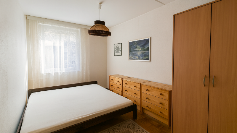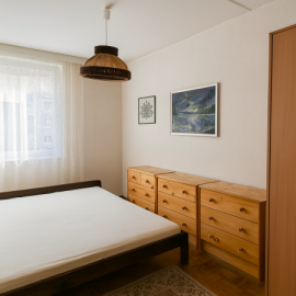 A lakás praktikus elrendezésű: a fürdőszoba az előszobából és a hálószobából is megközelíthető, ami kényelmes mindennapi használatot biztosít. A hálószoba és a fürdőszoba között egy nagy méretű beépített szekrény található, amely jelentős tárolóhelyet kínál.