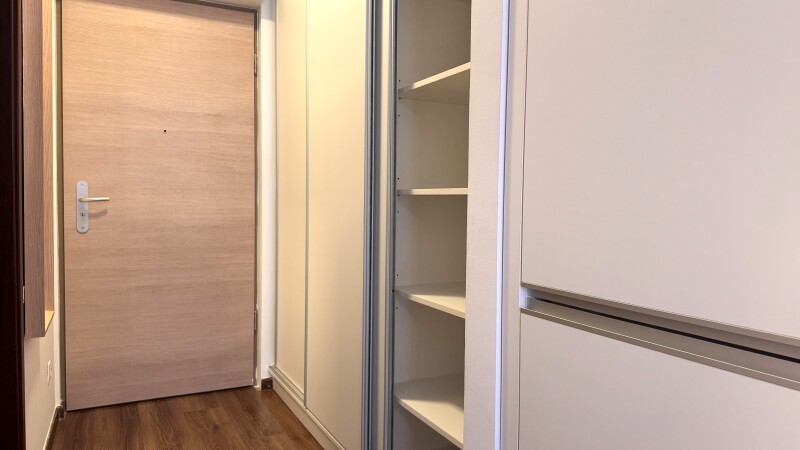 A lakás teljesen bútorozott és gépesített, valamint klímával felszerelt, így azonnal költözhető. A folyosón egy nagyméretű beépített szekrény található, amely bőséges tárolóhelyet biztosít.