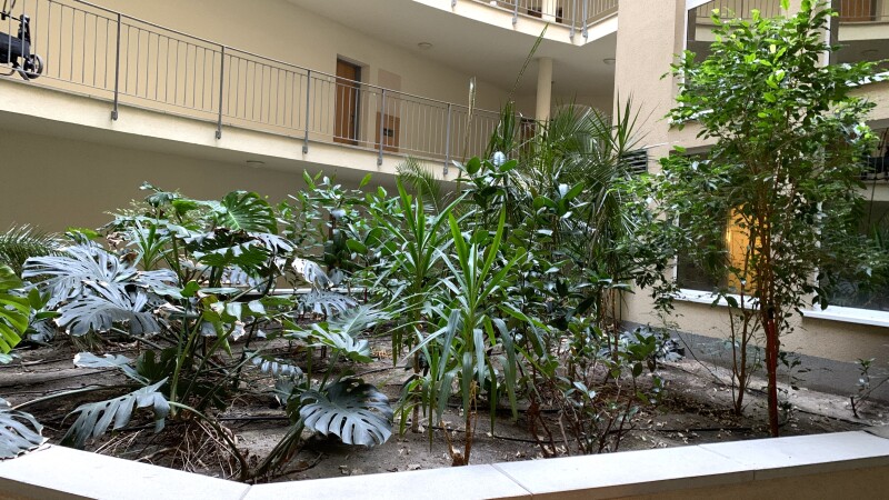 A ház újszerű, modern, hőszigetelt épület, rendkívül alacsony fűtésigénnyel és saját mérőórákkal. A belső közlekedő terek üvegtetősek, gondozott növényzettel, pálmaház jellegű hangulatot árasztanak. A lakópark zárt, biztonságos, saját belső parkkal rendelkezik.