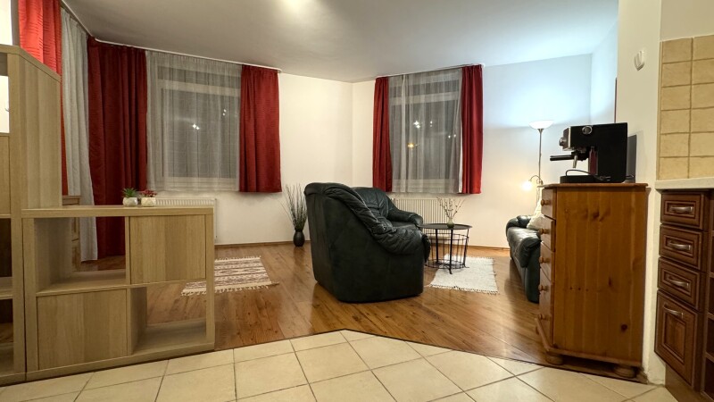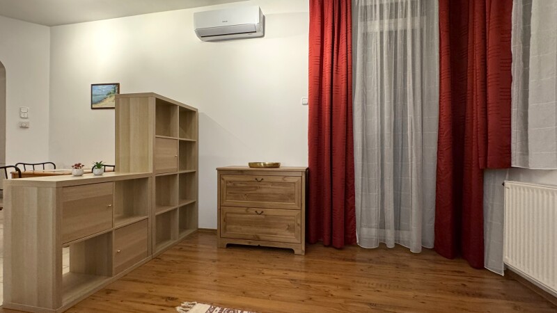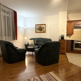 A lakás amerikai konyhás nappaliból és külön hálószobából áll, teljesen bútorozott és gépesített (mosógép, mosogatógép, klíma mindkét helyiségben). A nappaliban bővíthető ágy található, így akár vendégek fogadására is alkalmas.